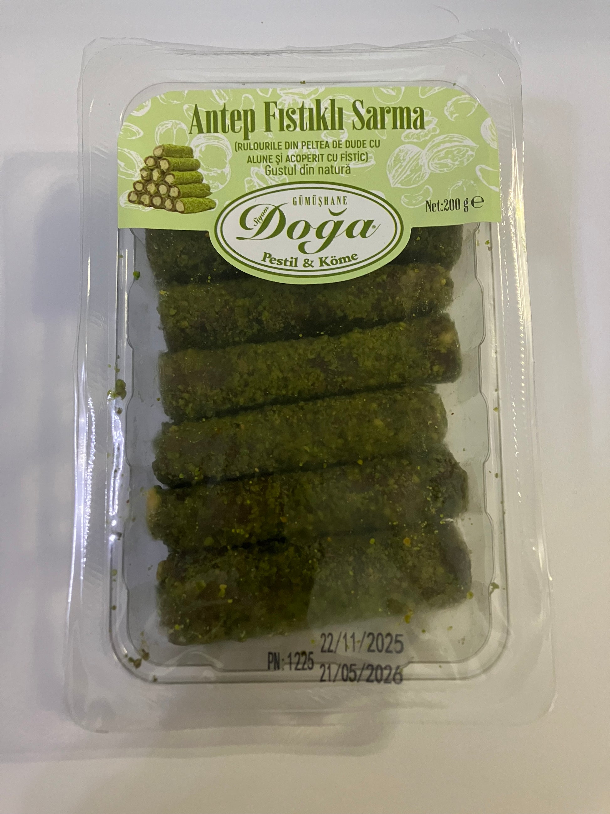 Our master confectioners hand-roll sheets of mulberry pestil around a ribbon of hazelnut filling, then press the cylinder into a bed of freshly crushed Antep pistachios. The contrast of colors—deep amber pestil against bright green nuts—is simply stunning.