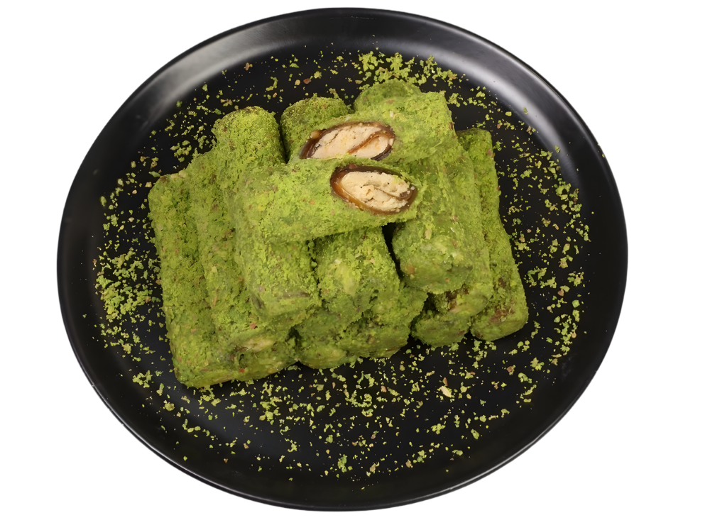 A “crown jewel” roll finished with pistachios, green gold. Hand-rolled around a ribbon of hazelnut filling, pressed into freshly crushed pistachios—deep fruitiness with gently sweet pistachio notes.